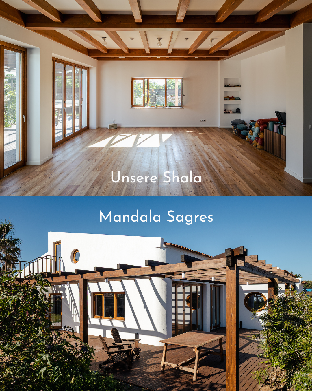 Unsere Bhakti Yoga Ausbildung findet im Mandala Sagres statt – einer lichtdurchfluteten, ruhigen Shala, nur 10 Minuten vom Meer entfernt. Hier üben, singen und praktizieren wir täglich in einer warmen, herzöffnenden Atmosphäre.