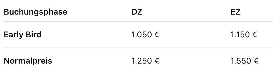 Gesamtpreis ab 1050 Euro je nach Zimmerkategorie
